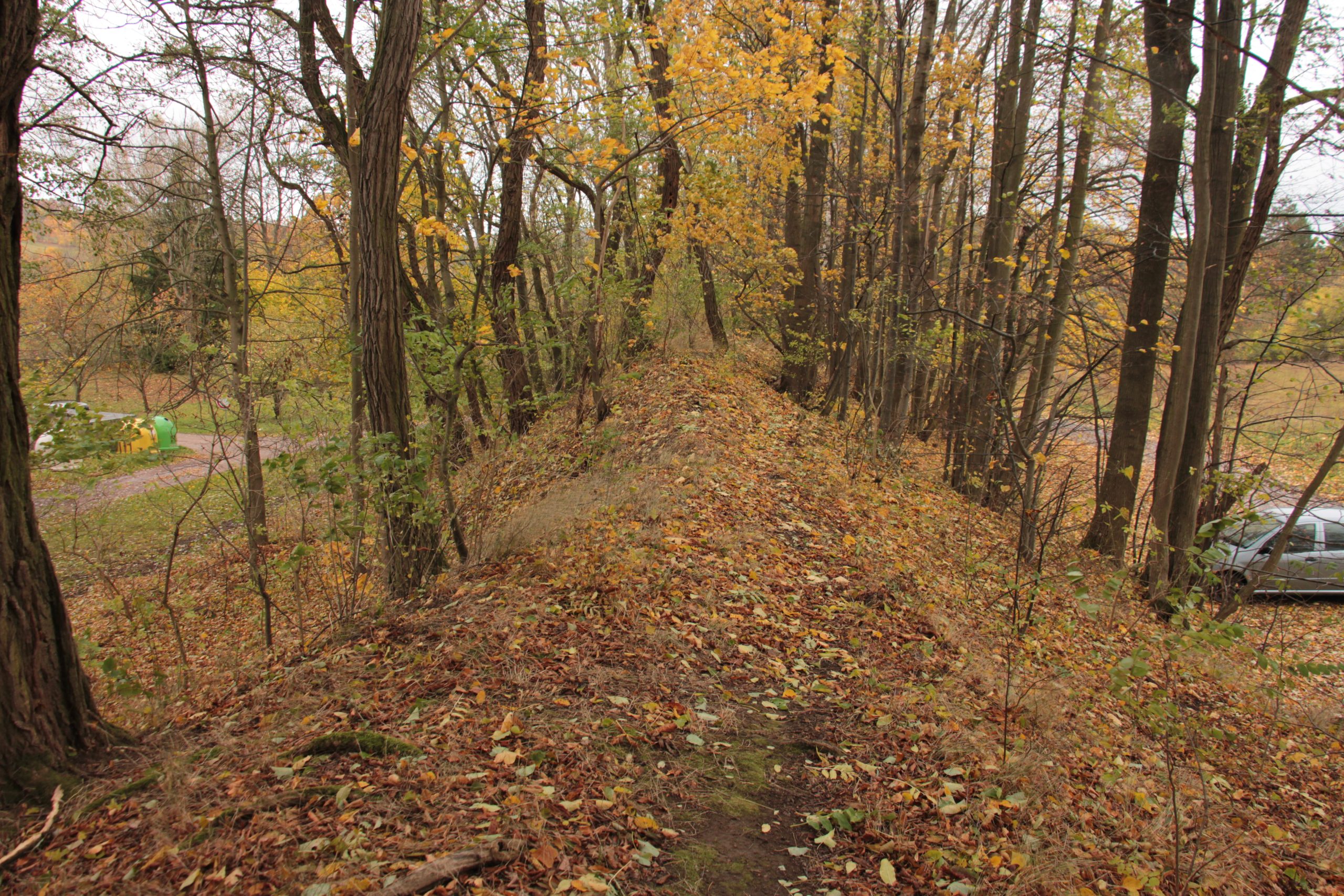dohání. Bohužel se z údolí opět vynořujeme a futeř i s drobným pršením nám dává co proto. Stojíme před rozhlednou Boika poblíž Lhotice a nahoru do ochozu nás to netáhne. Hnáni větrem, bičováni kapkami vstupujeme do Lhotice. V asfaltce nacházíme první artefaxis po cyklistixistovi a to páčkix brzdy. Jak do obce vcházíme, tak zase odcházíme. Cesta od Boiky klesá, silnice kličkuje po vrstevnicích serpentínama. My jdeme přímo, serpentiny ignorujeme až do Hradiště. U Evangelickýho kostela jsou vidět valy Oppida. Šustix jde tentokrát po funerálních památkách. Necháváme ho v nekropoli a jdeme z předhradí do akropole. Oppidum na ostrožně obtékané Chrudimkou bylo dvojdílné. Boční strany ostrožny strmě spadají do údolí řeky a severní část vybíhá do protáhlého klesajícího hřbetu. Na východní straně se nacházelo předhradí o rozloze osm hektarů a západní část