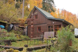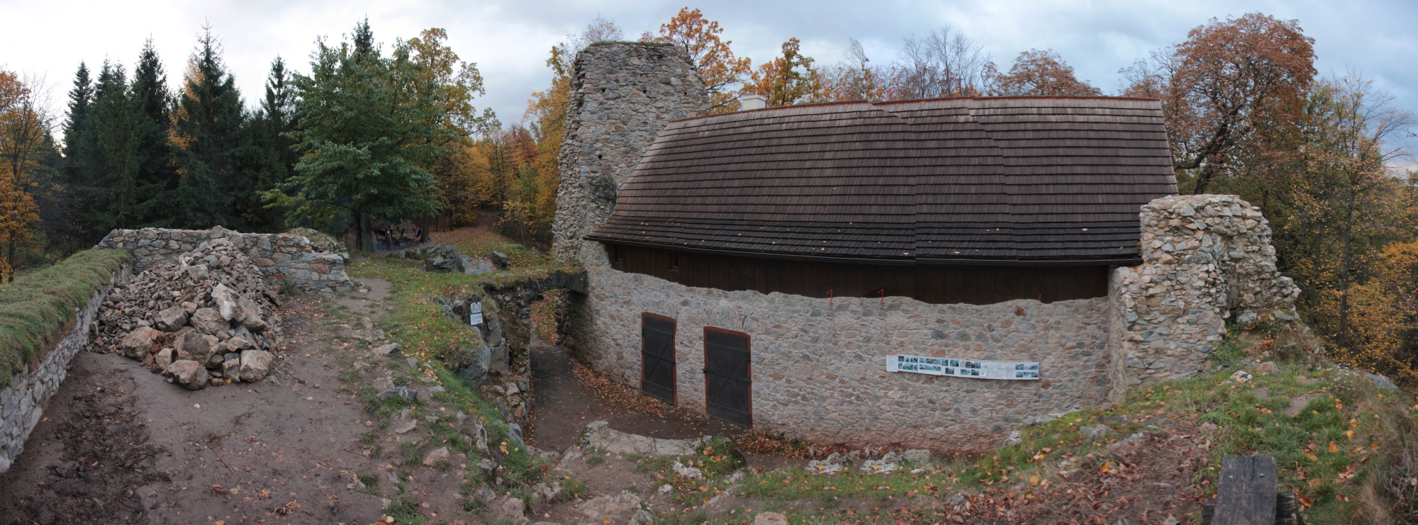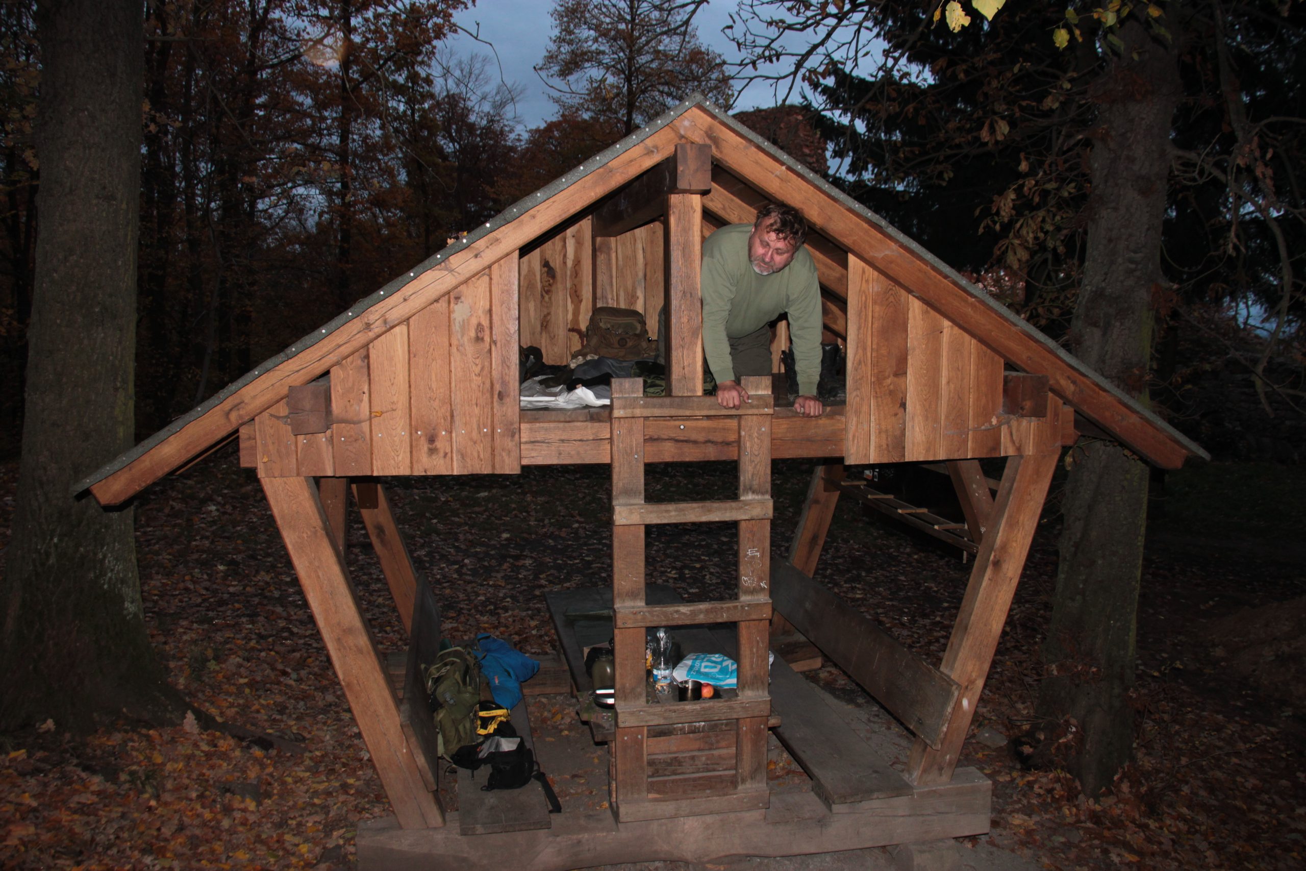 kterých zatéká, se nachází silně poškozený nábytek a kachlová kamna. V roce 1975 zůstávají z paláce stát jen obvodové zdi s řadou sgrafit. Dneska stojí v předhradí turistickej přístřešek a máme štěstí, přístřešek s ložnicí v podkroví je volnej, máme kde přespat a nemusíme stavět celtix. Jdeme rozdělat oheň, vyndáváme jídlo, vaříme si čaj. Sotva jsme se najedli, začínaj padat první kapky, tak se přesouváme pod přístřešek a protože je chladno a není na co čekat, lezeme do nízký ložnice v podkroví. Při rozbalování ležení dochází ke komickým situacím i několikanásobnýmu bouchnutí do hlavy. Nakonec ležíme, venku prší, povídáme si. Je půl deváty, když usínáme. V jednu v noci se na chvilku budíme, trochu si zase povídáme a pak zase usínáme. Spíme do rozednění.
